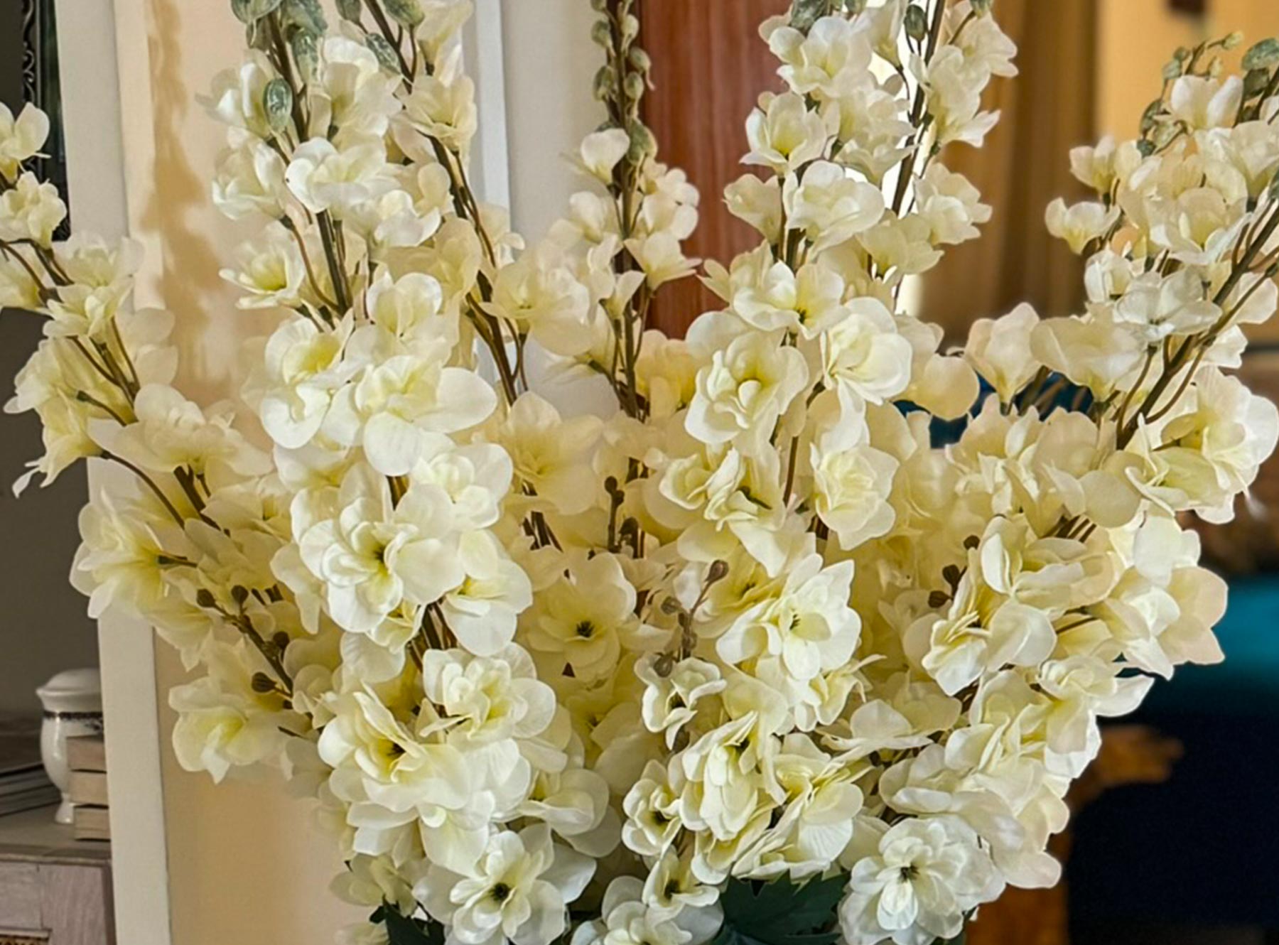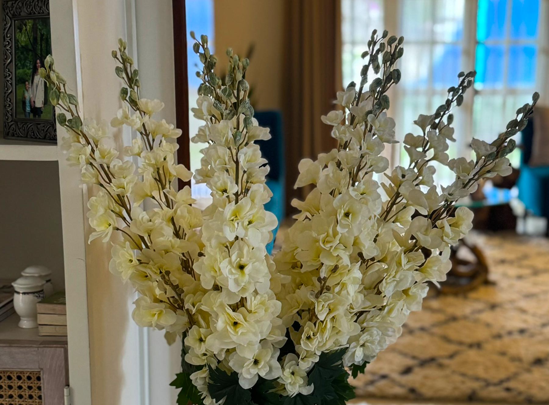 Tall white delphiniums designed to bring height, structure, and sophistication to modern spaces.