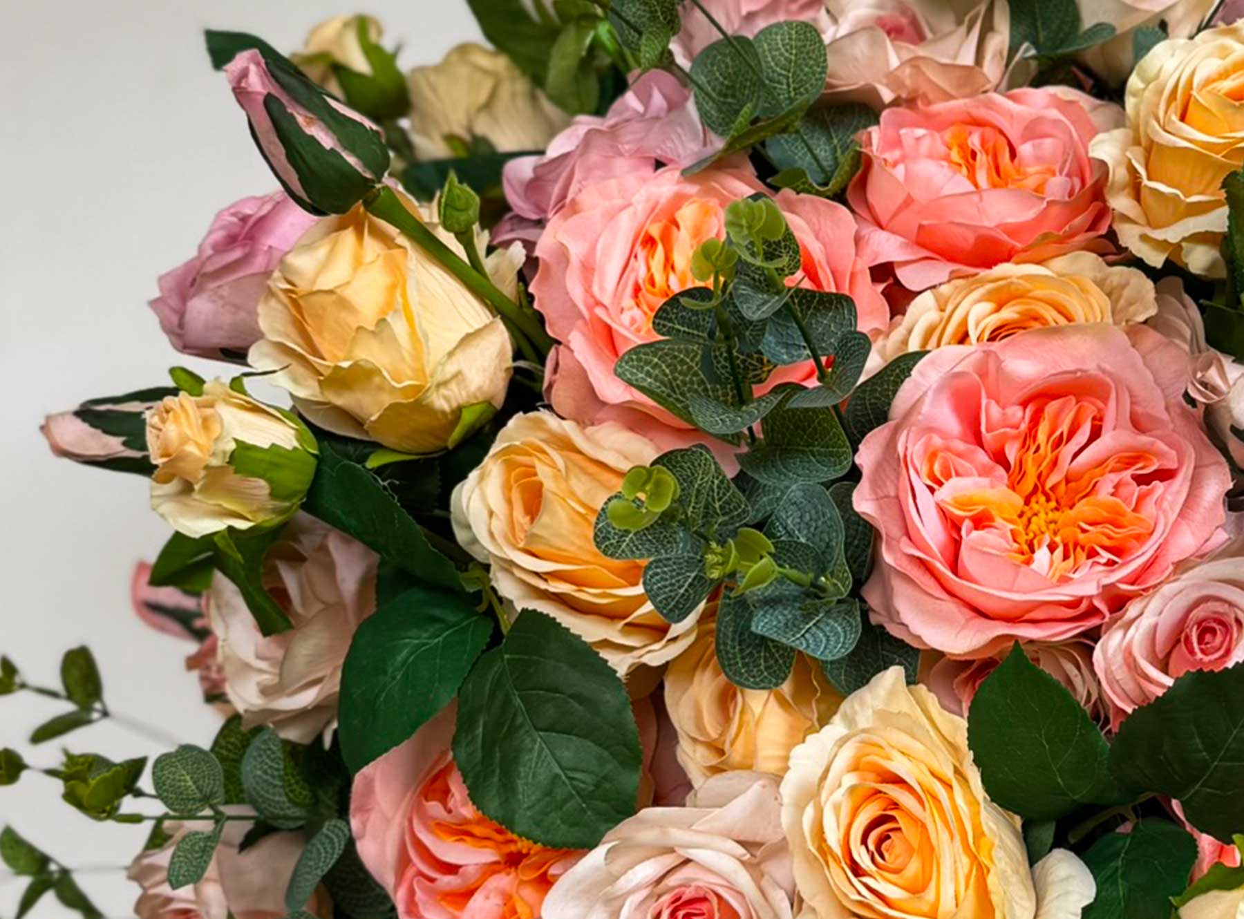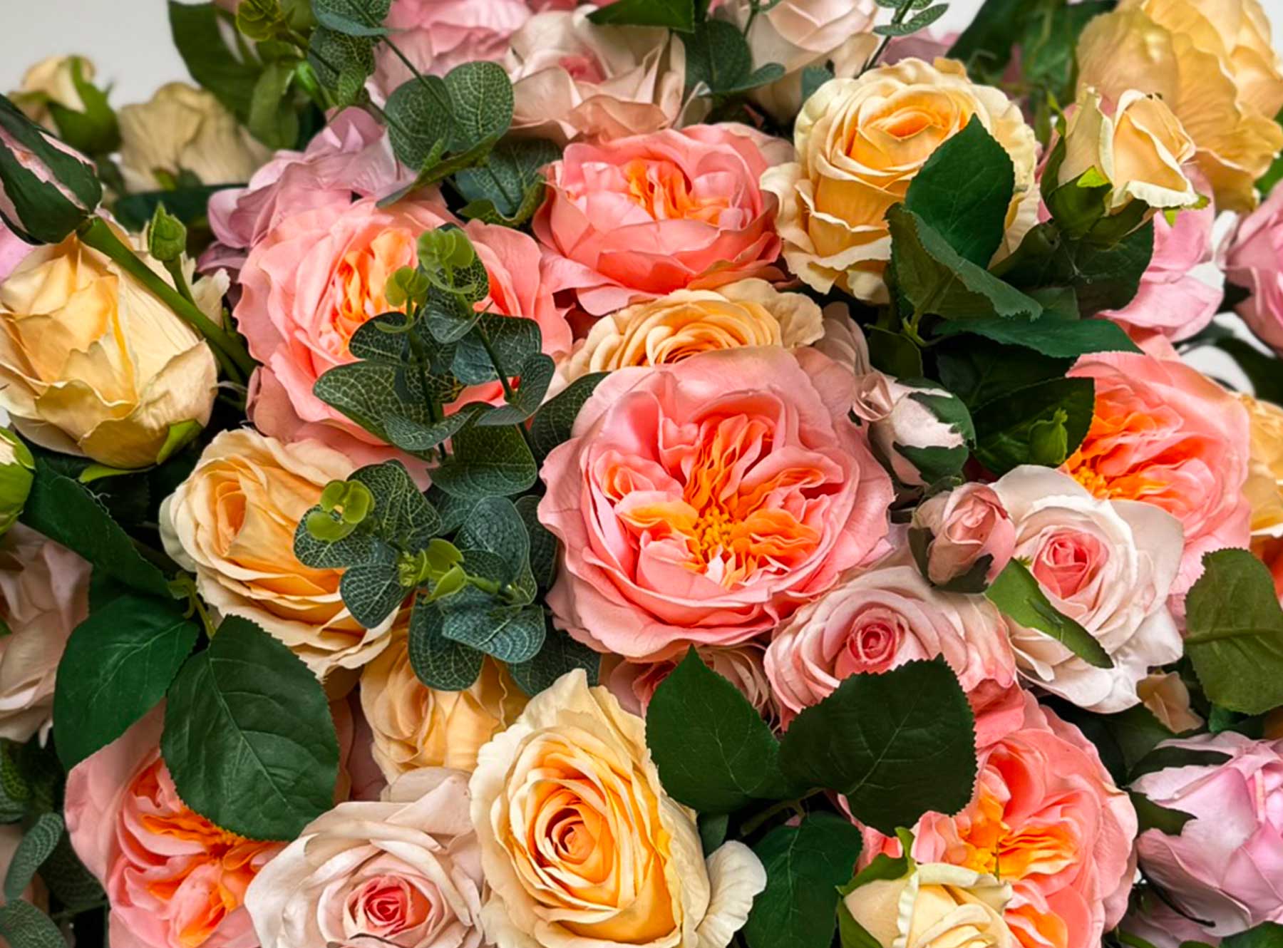 Romantic, abundant, and timeless an ode to the beauty of English gardens in full bloom, with lush coral and peach roses