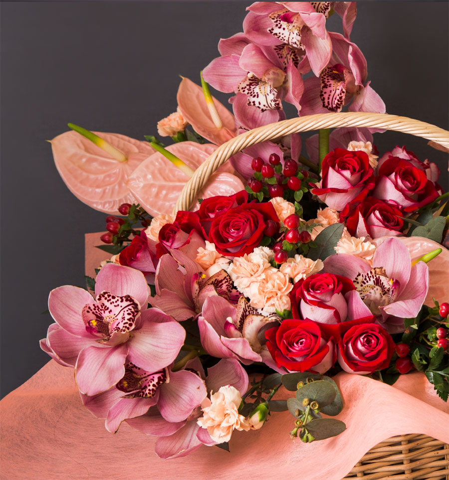Pink Cymbidium Orchids, Peach anthuriums & dainty Brazilian lady roses & red berries, presented in a basket, with a bottle of sula chenin blanc. You can choose to send this with or without the wine. A scrumptious chocolate cake daintily decorated with roses & berries, on the side.