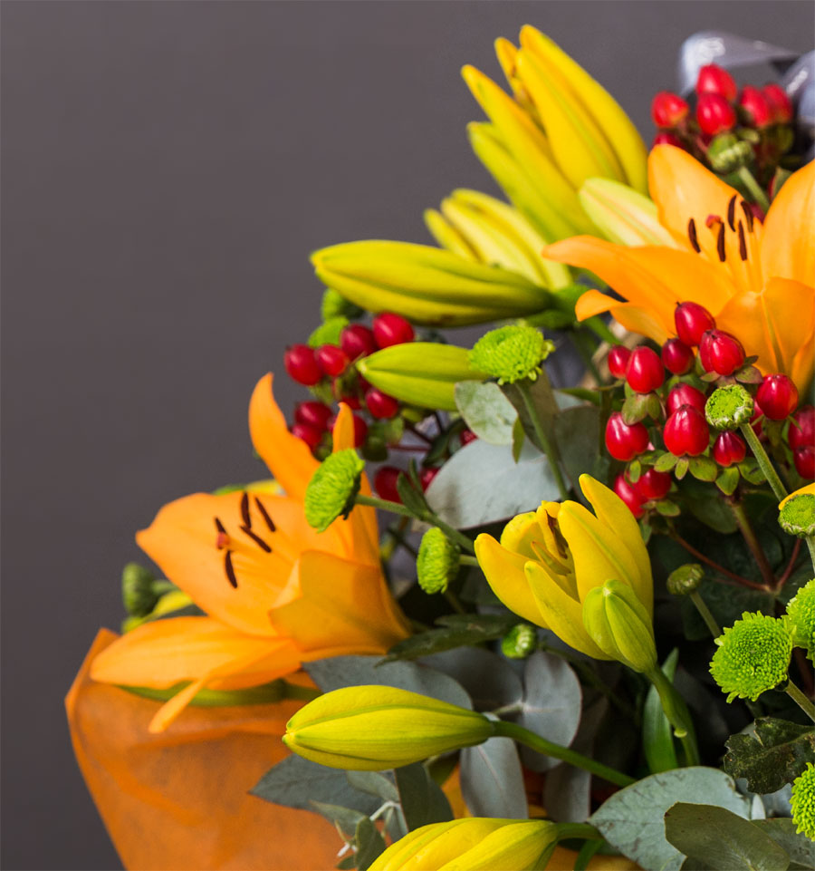 Nothing can brighten up a room like a basket full of yellow & orange Asiatic lilies, with a touch of red berries, green chrysanthemums & silver dollar.
