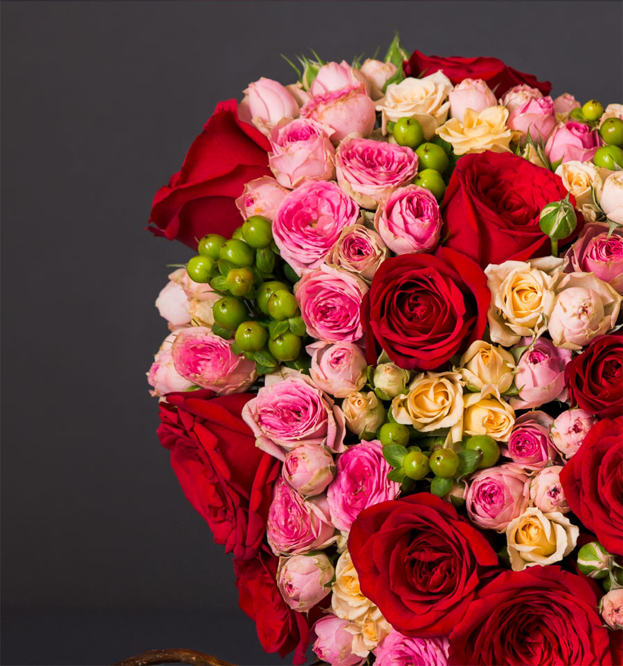 Heart shaped arrangement with spray roses, red roses, cymbidium orchid & berries