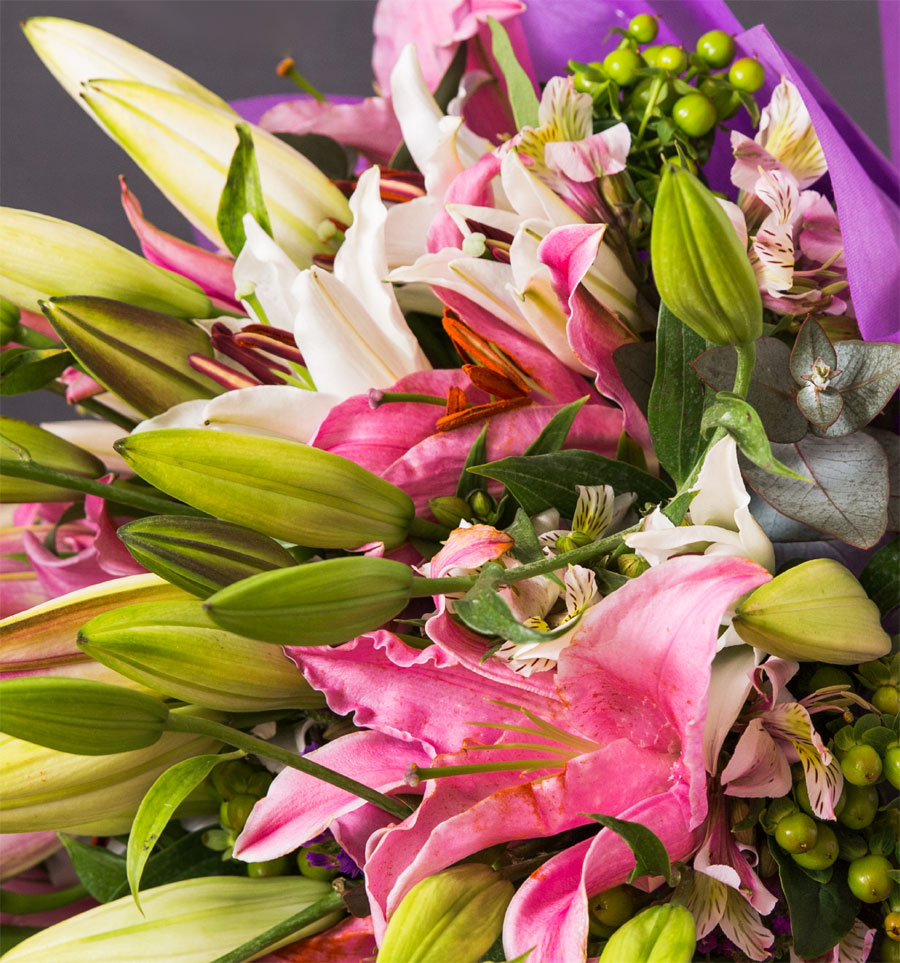 The classic fragrant pink and white oriental lilies paired with alstroemeria and berries make this an all-time favourite, filling the room with fragrance, freshness, and positive vibes. A perfect choice from any Luxury bouquet shop for gifting elegance and timeless beauty.