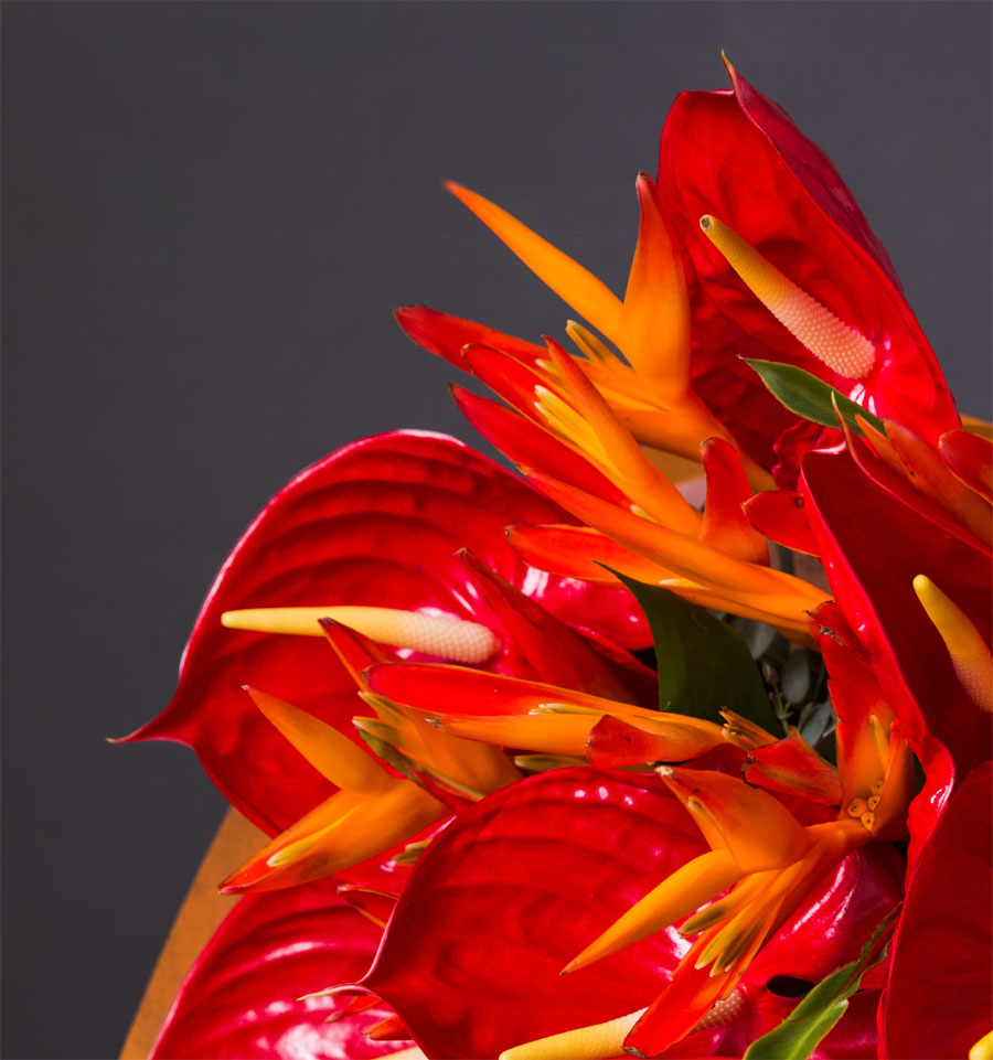 The Tropical Sunrise premium bouquet features striking red anthuriums paired with tropical heliconia, accented with fresh eucalyptus and wrapped in refined rice paper. Each stem is carefully selected to highlight texture, colour, and longevity, making this bouquet a perfect blend of drama and elegance.