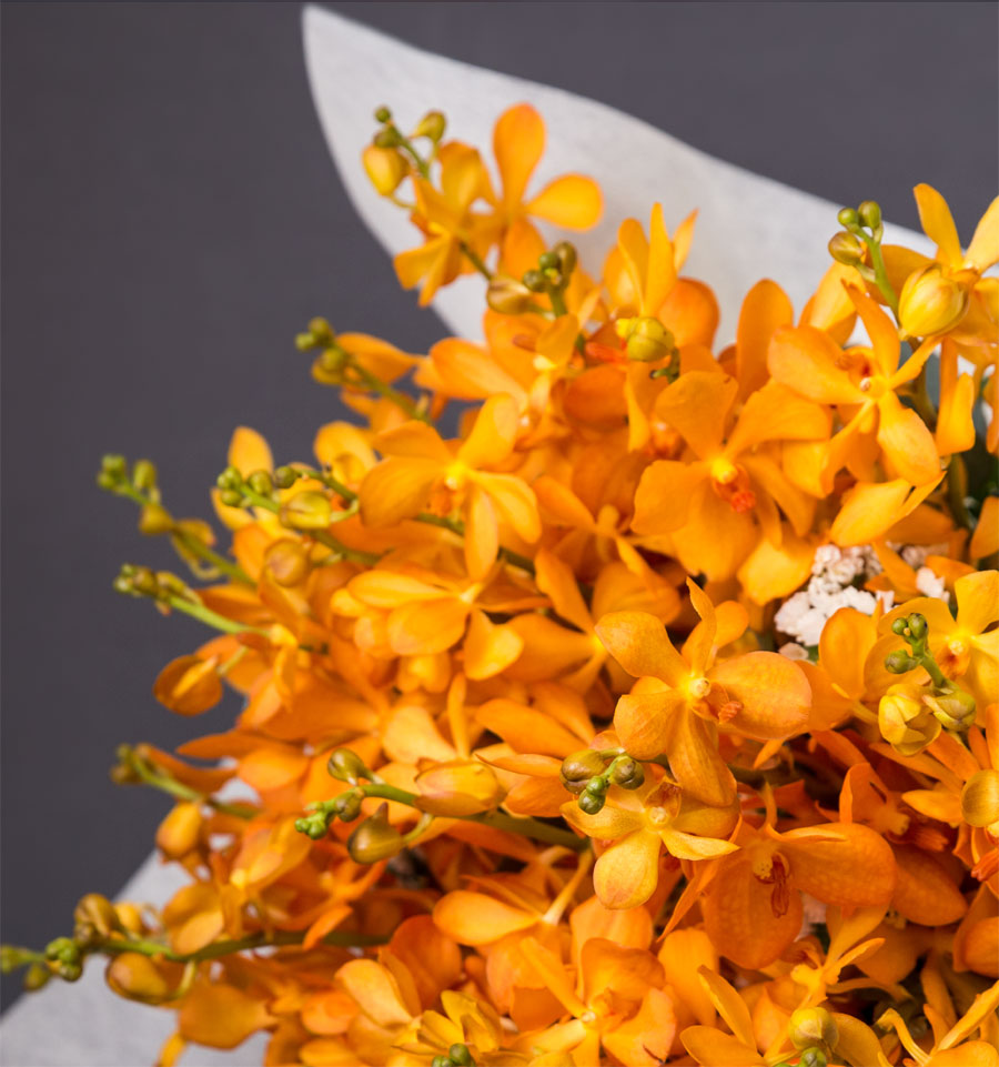 A bouquet of Yellow Mokara Orchids, with a touch of statice & greens, beautifully wrapped with rice paper. Perfect gift for any occasion.
