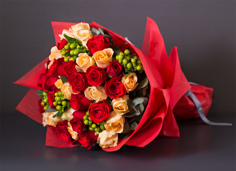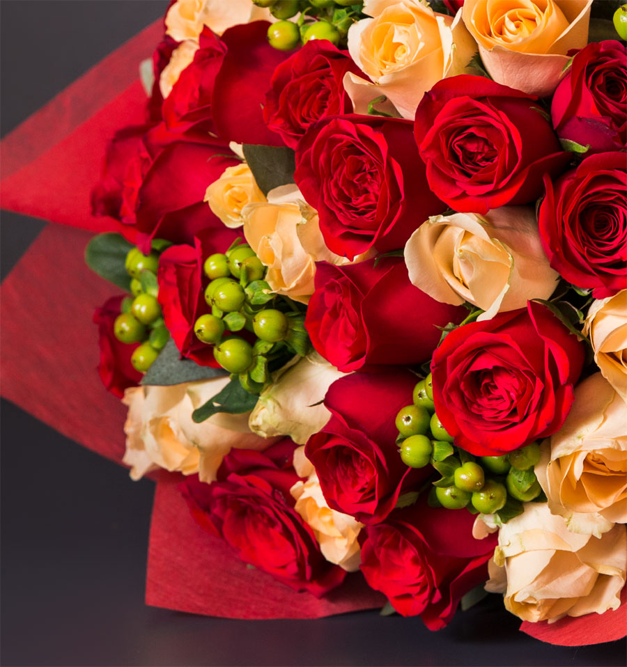 A classic and beautifully crafted luxury flower bouquet featuring red and peach long-stemmed roses, green berries, and silver dollar eucalyptus. Elegantly wrapped, this premium arrangement is perfect for expressing love, admiration, and timeless romance an ideal gift for your lady love on any special occasion.