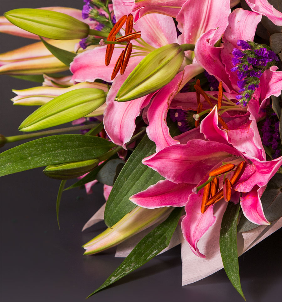 A bouquet of pink oriental lillies is never out of fashion, with a touch of statice & eucalyptus & elegant wrapping. This bouquet can be gifted on all occasions.