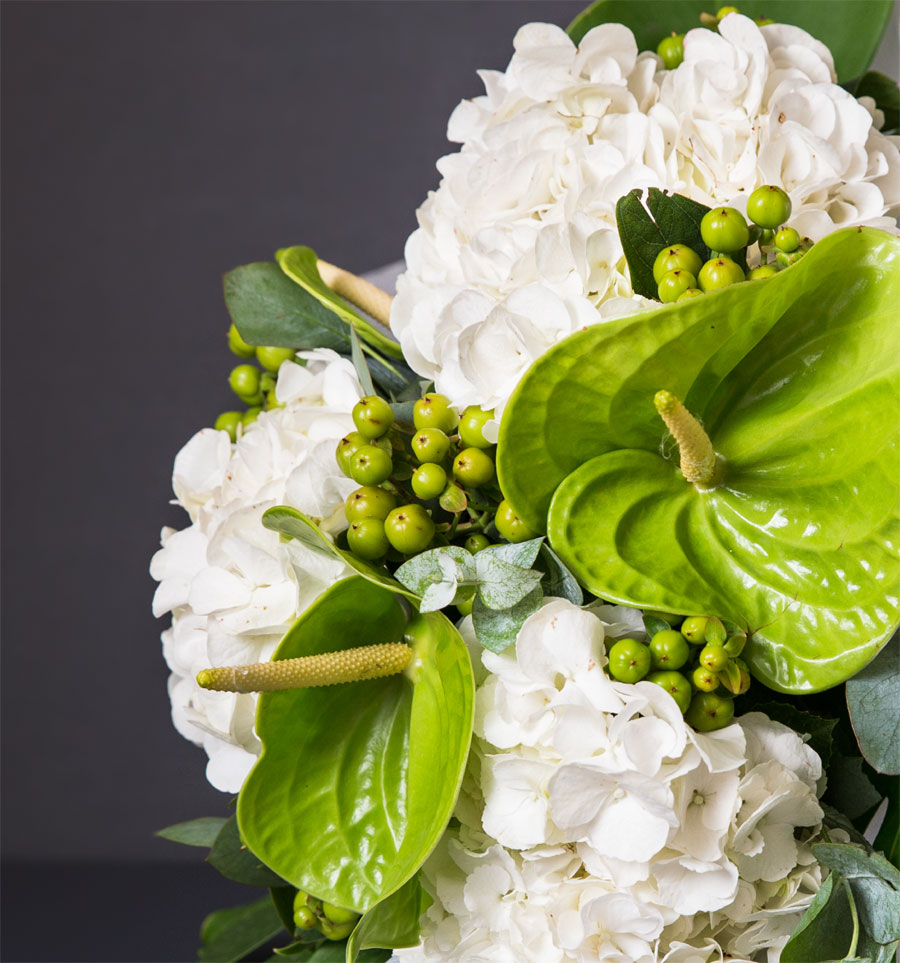White hydrangeas, green anthuriums, green berries, with monstera leaves & eucalyptus, wrapped in rice paper. A bouquet of elegance for any occasion.