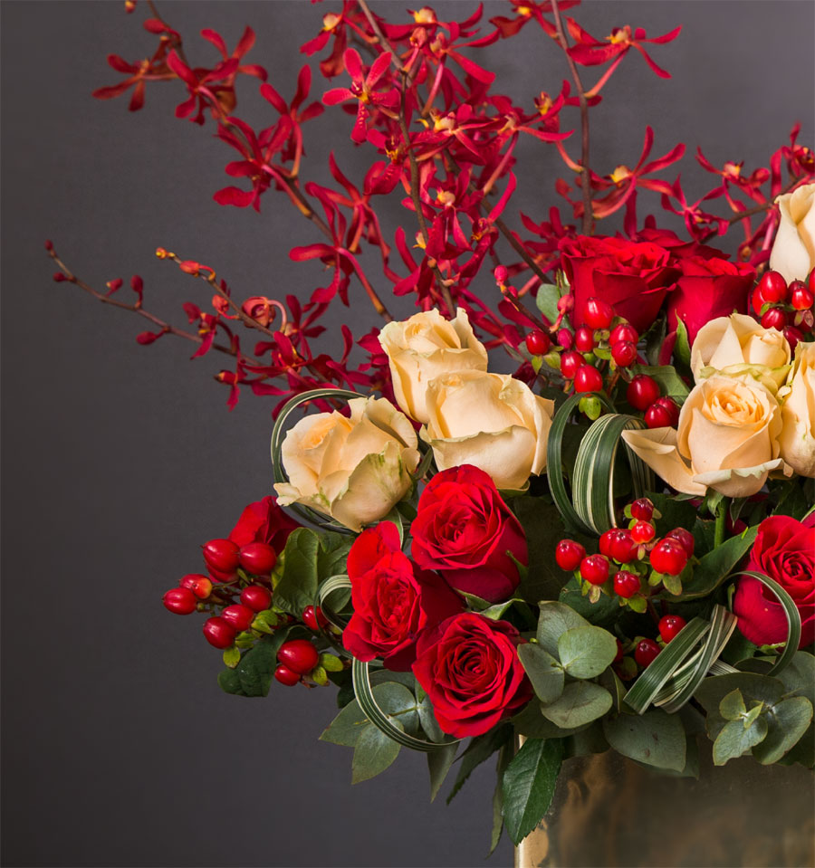 Classic bright red orchids, with red & peach roses artistically arranged with ribbon grass & other fillers.