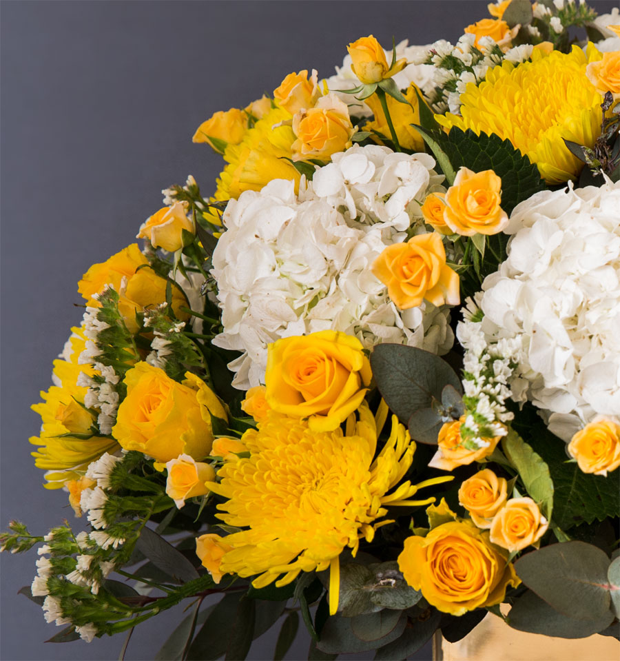 White hydrangeas, yellow disbuds & yellow roses, with silver dollar set beautifully in our specially designed square brass planter box. This makes a very special gift to cheer someone up for any occasion.