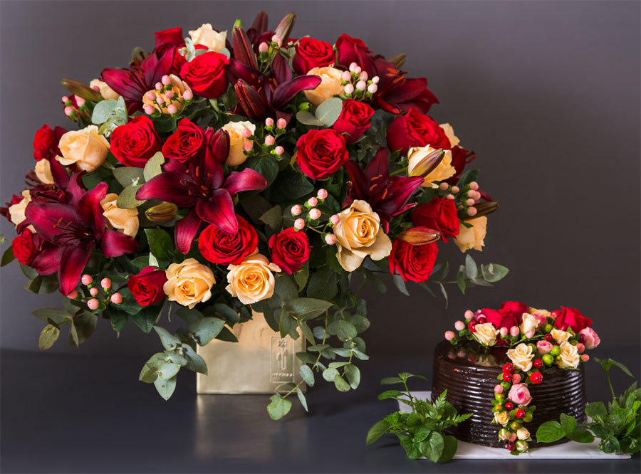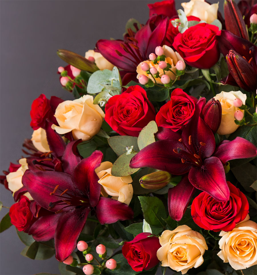 Blood red lilies with peach & red roses, pink hypericum berries & silver dollar set in our beautiful brass planter box. This arrangement is a stunner.
