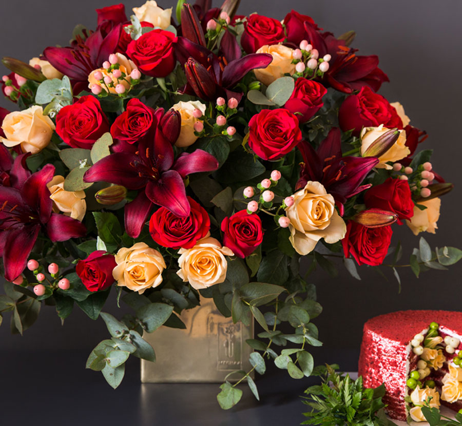 Blood red lilies with peach & red roses, pink hypericum berries & silver dollar set in our beautiful brass planter box. This arrangement is a stunner.