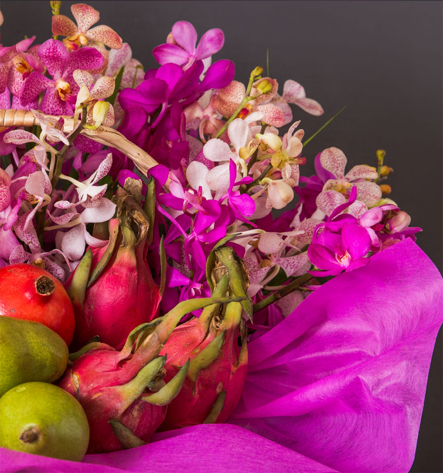 Mokara Orchids with a mix of dragon fruit, Pomogranate, oranges & pears. Take it for a house warming, Say' I care' or simply just.