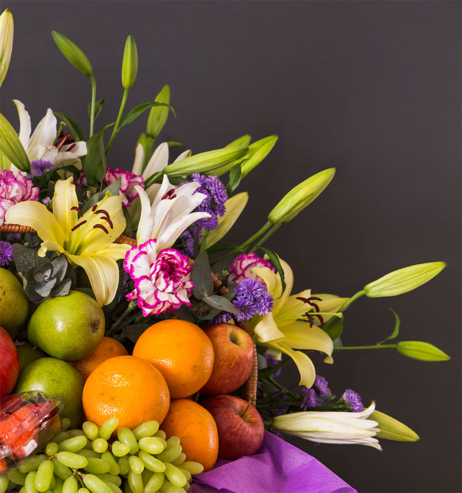 Yellow oriental lilies with carnations & daisies & a mix of strawberries, oranges, pomegranate, pears & grapes in a cane basket.