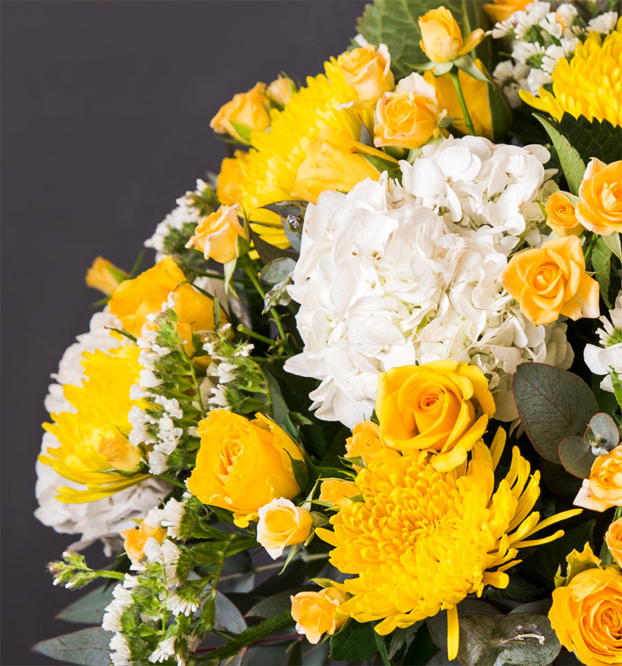 White hydrangeas, yellow disbuds & yellow roses, with silver dollar set beautifully in our specially designed square brass planter box. This makes a very special gift to cheer someone up for any occasion.