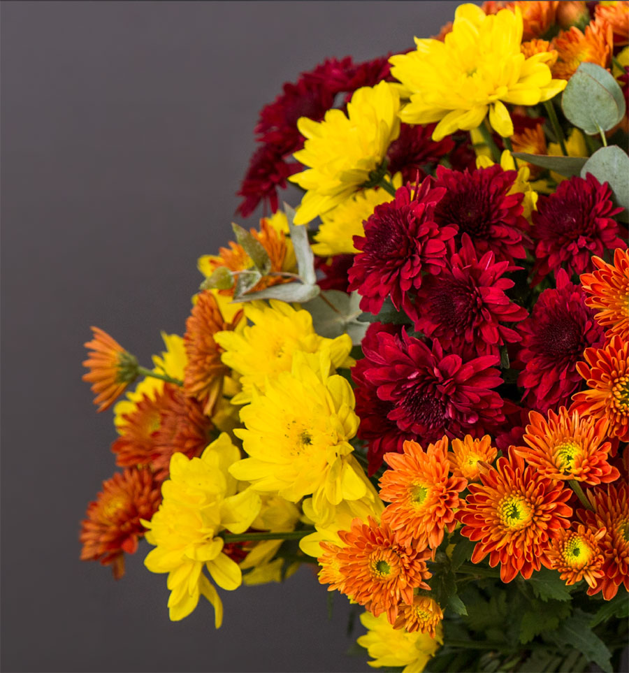An assortment of fine chrysanthemums & ferns, in our signature grey box.