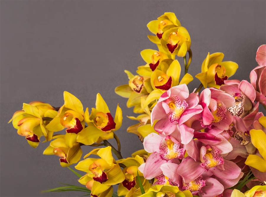 A mix of cymbidium orchids, with palms, makes for a grand gift, for someone you care.