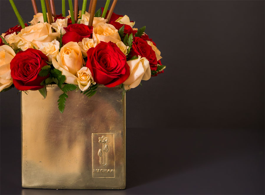 Peach & red Anthuriums, peach & red roses, set elegantly in our specially designed brass planter box. This is perfect as a gift for any occasion.
