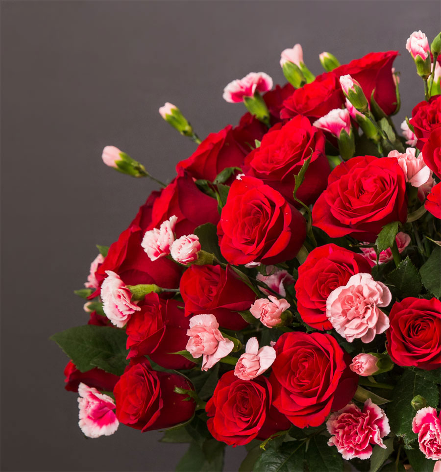 Red roses & pink spray carnations, with eucalyptus, set in our signature square copper vase. A classic that can never go out of style.