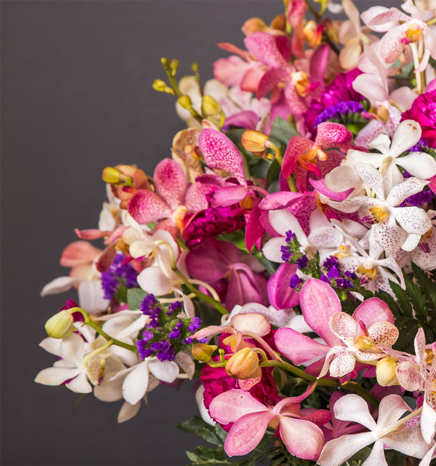 A cane basket filled with tropical mokara orchids, with a touch of carnations, statice, eucalyptus & ferns.