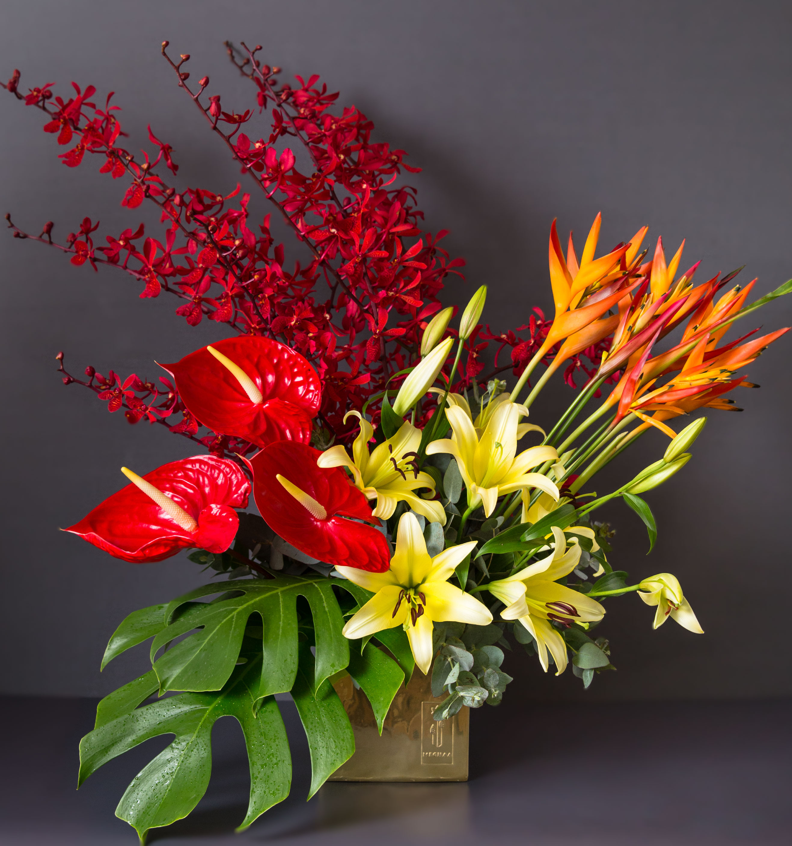 Bright red orchids, tropical heliconia, red anthuriums & yellow lilies, with monstera leaves
