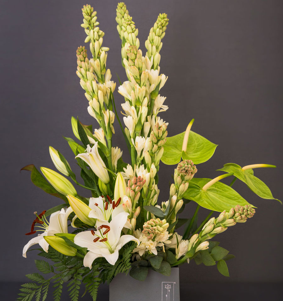 Fragrant tuberoses, oriental lilies & green anthuriums, set in our flowerbox signature grey box.